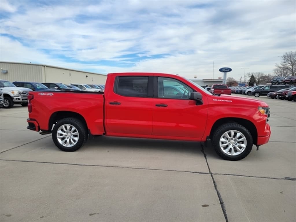 Clean CARFAX. Red Hot 8-Speed Automatic, 4WD, Black Cloth, 10-Way Power Driver Seat w/Lumbar, 120-Volt Bed Mounted Power Outlet, 120-Volt Instrument Panel Power Outlet, 3.5`` Monochromatic Display Driver Info Center, Bluetoothà For Phone, Chevrolet Connected Access Capable, Color-Keyed Carpeting Floor Covering, Compass, Custom Convenience Package, Custom Value Package, Deep-Tinted Glass, Dual Rear USB Ports (Charge Only), Electric Rear-Window Defogger, Electrical Steering Column Lock, Electronic Cruise Control, EZ Lift Power Lock & Release Tailgate, Front Frame-Mounted Black Recovery Hooks, Front Rubberized Vinyl Floor Mats, HD Rear Vision Camera, High Capacity Suspension Package, Hitch Guidance, LED Cargo Area Lighting, Manual Tilt Wheel Steering Column, OnStar & Chevrolet Connected Services Capable, Power Front Windows w/Driver Express Up/Down, Power Front Windows w/Passenger Express Down, Power Rear Windows w/Express Down, Preferred Equipment Group 1CX, Rear 60/40 Folding Bench Seat (Folds Up), Rear Rubberized-Vinyl Floor Mats, Remote Keyless Entry, Remote Vehicle Starter System, SiriusXM Radio, Standard Tailgate, Theft Deterrent System (Unauthorized Entry), Trailering Package, Wi-Fi Hot Spot Capable, Wireless Phone Projection.2023 Chevrolet Silverado 1500 Custom 4D Crew Cab 2.7L Turbo 8-Speed Automatic 4WDDon`t miss your chance to SAVE HUGE $$$ at Vermillion Ford!!